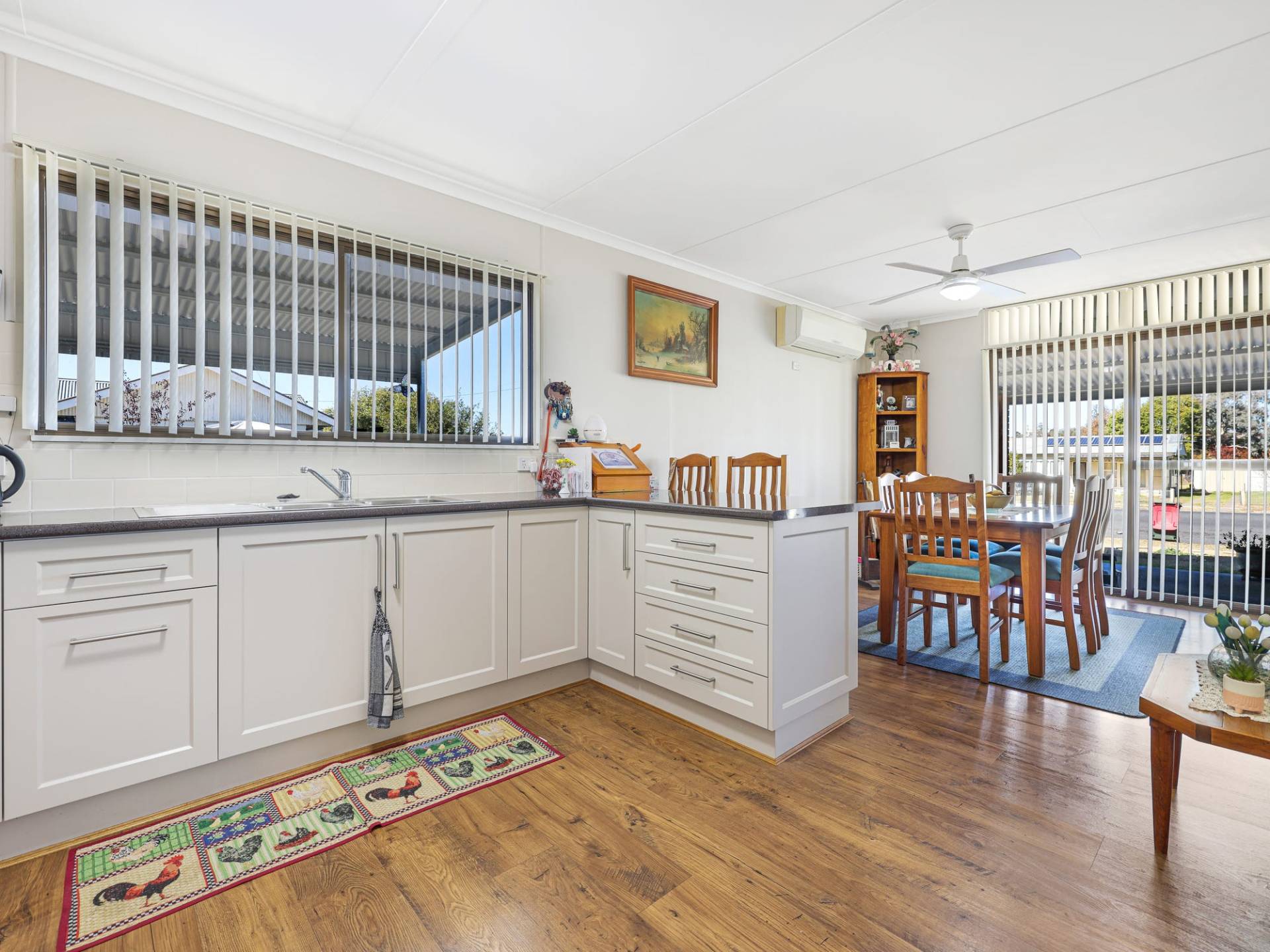 Offering 3 good sized with built-in robes, separate lounge and dining flowing seamlessly into the spacious, modern kitchen. The modern bathroom services the home perfectly with separate shower and bath. Climate control is easy with ceiling fans throughout, split system heating and cooling in the dining room and window air conditioner in the main bedroom.