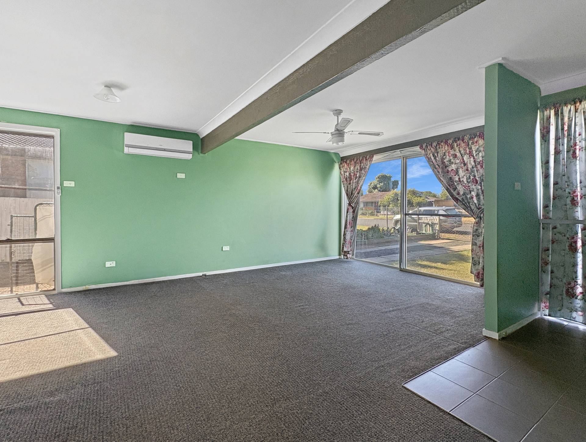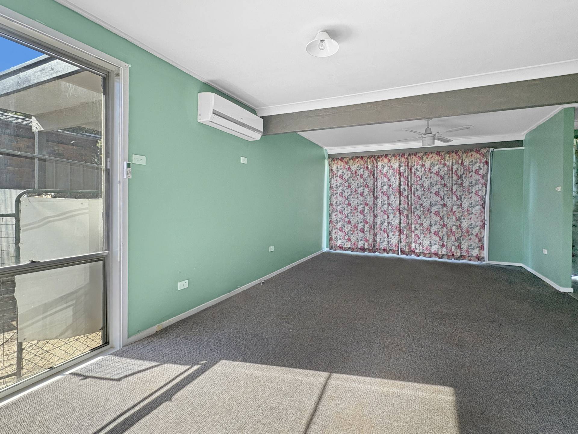 • Spacious living room adjoining the compact modern kitchen with split system air conditioning.
