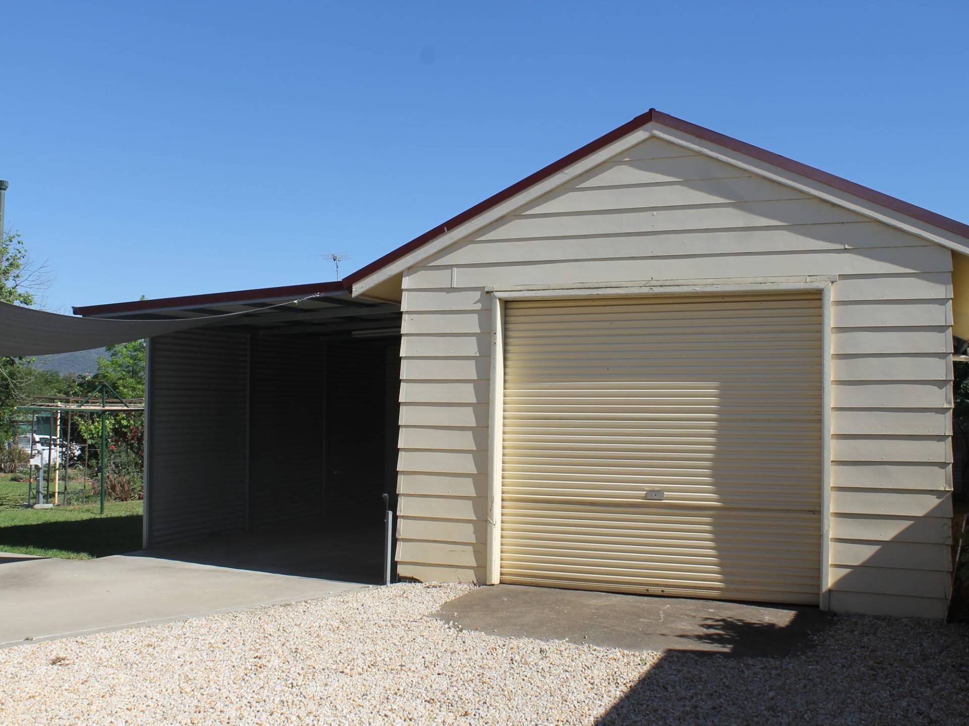 Single garage, double carport, workshop .